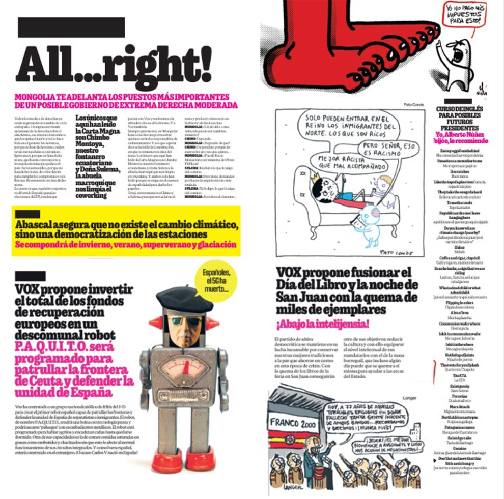 Por supuesto, no faltan nuestros clásicos internacionales: Milei, Trump, Bolsonaro, Meloni… ni tampoco ese vecino del quinto que “solo hace preguntas”. Porque sí, el fascismo también vive dentro de nosotros. Y mirarlo de frente —con humor, inteligencia y mala leche— es el primer paso para combatirlo.