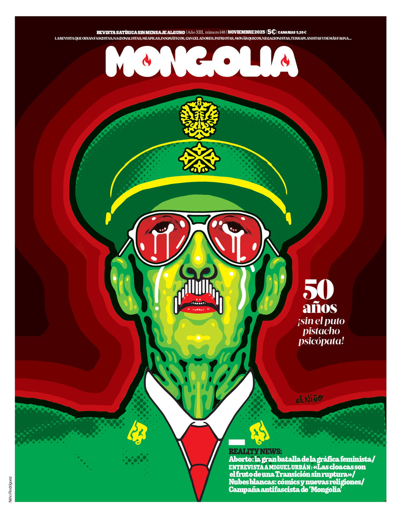 50 años del último mes de agonía no solo para el caudillo, sino para los españoles y españolas de bien que tuvieron que soportar una larga espera de casi cuatro décadas desde que el más psicópata de los enanitos de Blancanieves se alzó en armas y empezó a dar por culo. Y aunque siguen apareciendo hordas de nostálgicos, ultracatólicos y el fascismo se calza nuevas caretas a través del discurso de los cripto-bro, INCELS, Alt Rights, new-ages, negacionistas y demás fauna, la resistencia satírica continuará plantando cara al facherío rancio todo el tiempo que haga falta.