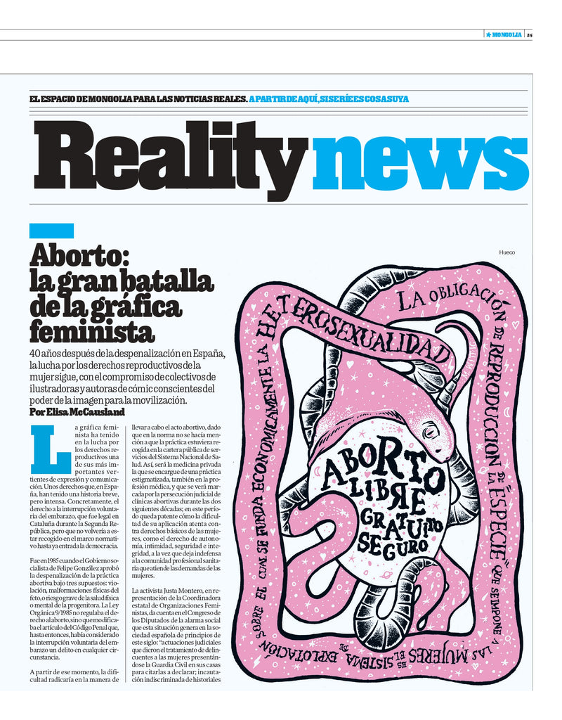El Reality News, la sección de información de Mongolia, analiza cuatro décadas de lucha por el derecho al aborto y las contribuciones de las ilustradoras y autoras de cómic a la causa, entrevista al exeurodiputado de Podemos Miguel Urbán sobre el burdo montaje de las cloacas del que fue víctima, y ofrece una nueva entrega de "religiones alternativas" concebidas para contrarrestar los dogmas monoteístas. Por su parte, los suculentos Breves repasan las novedades mediáticas, con el foco puesto en Mediapro y Prisa.